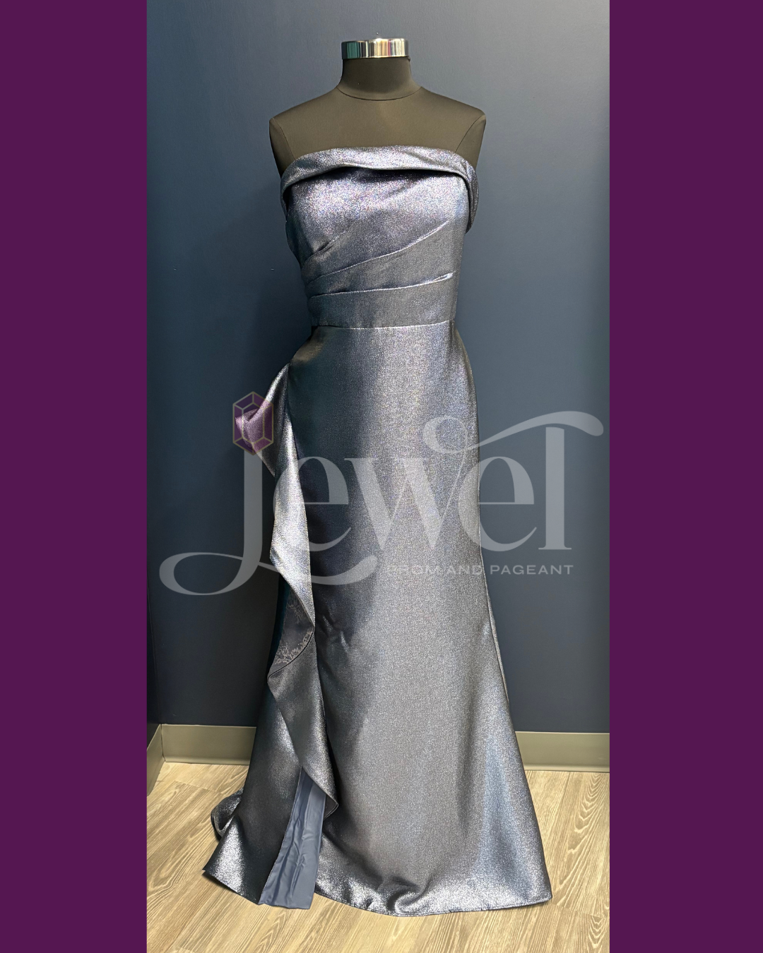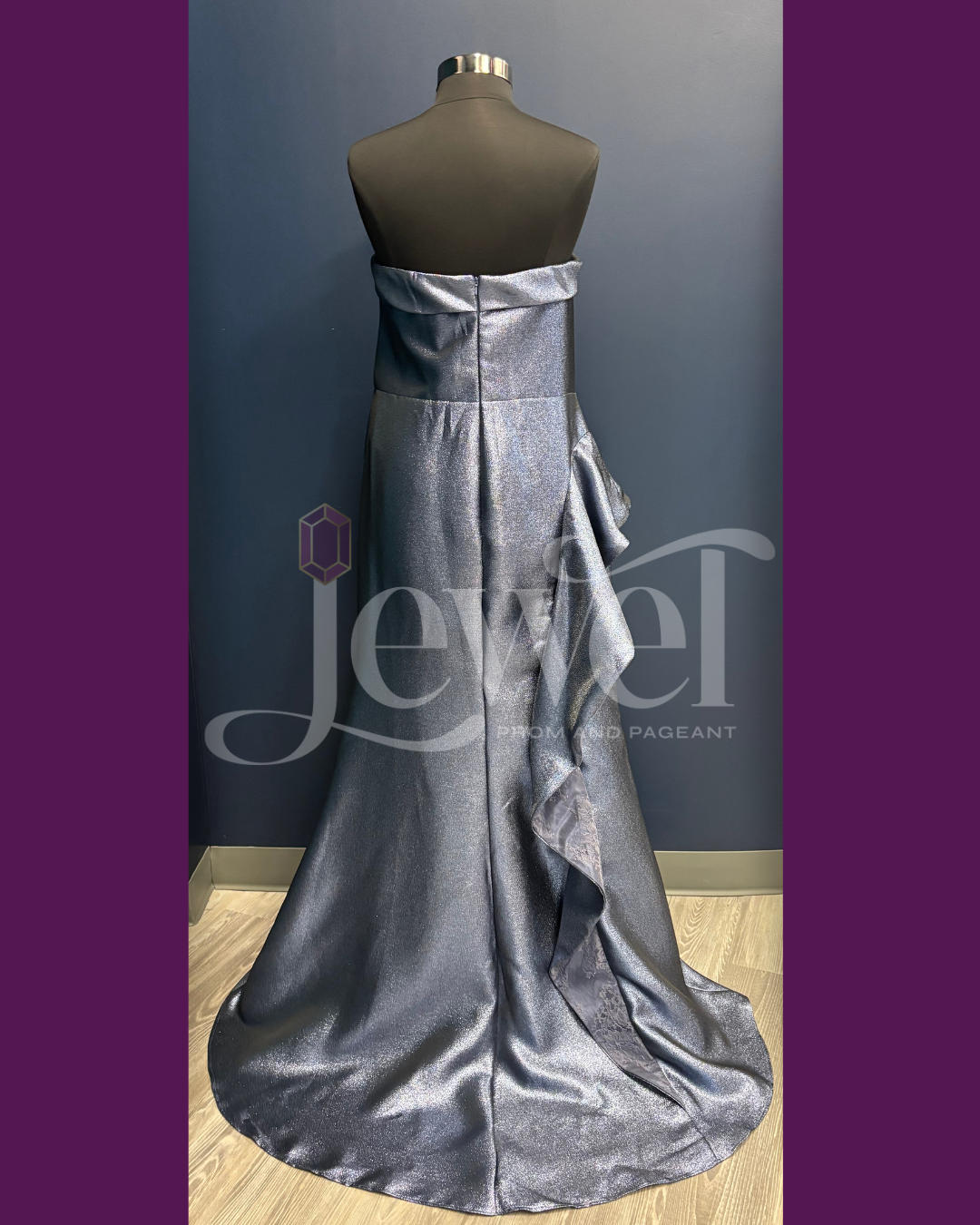 This elegant strapless gown features shimmering glitter fabric that catches the light beautifully. A ruffle detail gracefully cascades down the side of the skirt, leading to a flattering slit that enhances movement and allure. The waist is expertly ruched to accentuate your silhouette, creating a sophisticated and flattering fit perfect for any formal occasion.