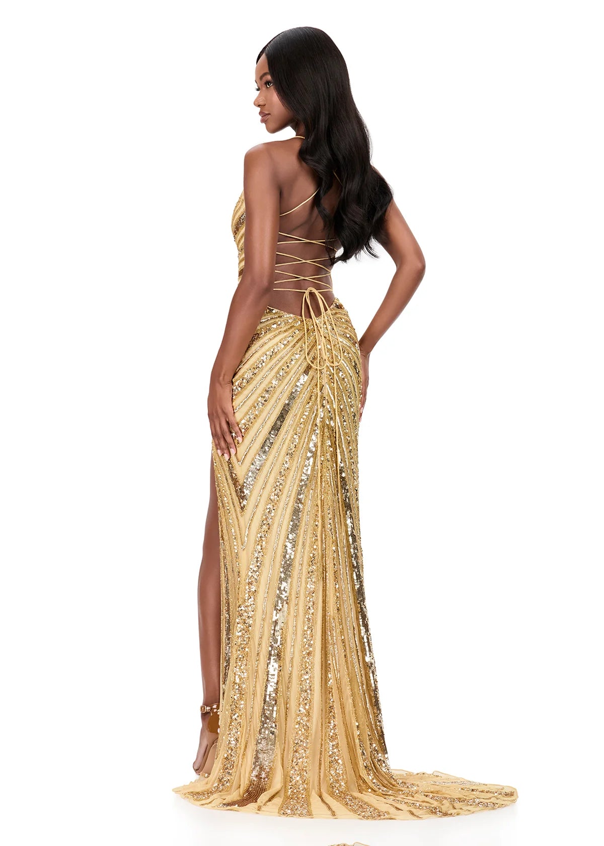 ASHLEYlauren Style 12149 is a show-stopping fully beaded gown engineered for maximum impact. This fitted silhouette features intricate beadwork that catches light from every angle, paired with a plunging neckline, high slit, and adjustable lace-up back for a custom, flattering fit. The dramatic sweeping train elevates the look from elegant to unforgettable. Perfect for prom, galas, and red-carpet moments where confidence and glamour are non-negotiable.