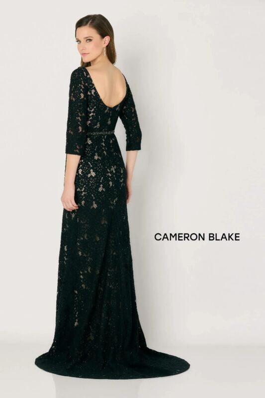 Cameron Blake CB789 Evening Gown This sophisticated mother of the bride dress showcases expert craftsmanship with its allover lace construction and refined silhouette. The fit-and-flare design flatters the figure, while the plunging V-neckline features a delicate mesh insert for added elegance. Slim straps provide comfortable support, and detachable three-quarter sleeves offer styling versatility for any occasion. A beaded waist cinches the frame with understated glamour, complemented by a graceful scoop back. The thigh-high off-center slit adds contemporary movement, while the sweep train creates a dramatic, polished finish. Perfect for milestone celebrations where timeless sophistication matters.